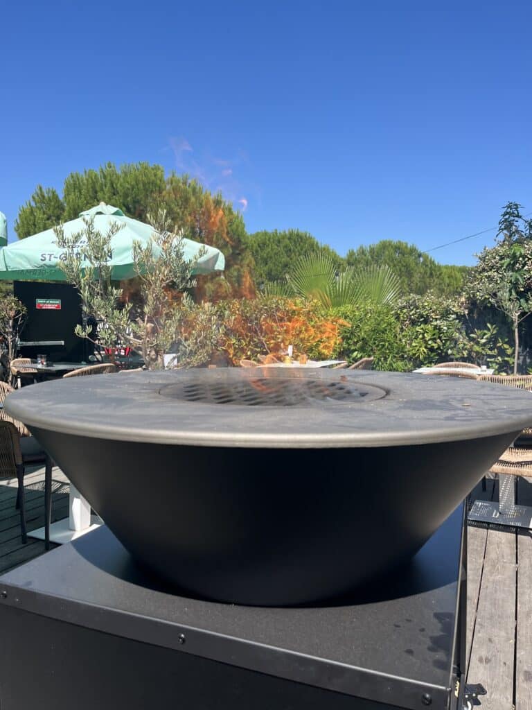 c’est BRASERO au Mas Campo. Un assortiment de viandes et poissons grillés, accompagné de frites maison, légumes à la provençale ou salade. Quoi de mieux pour tremper ses frites que des sauces maison, ou bien un camembert rôti à la braise.